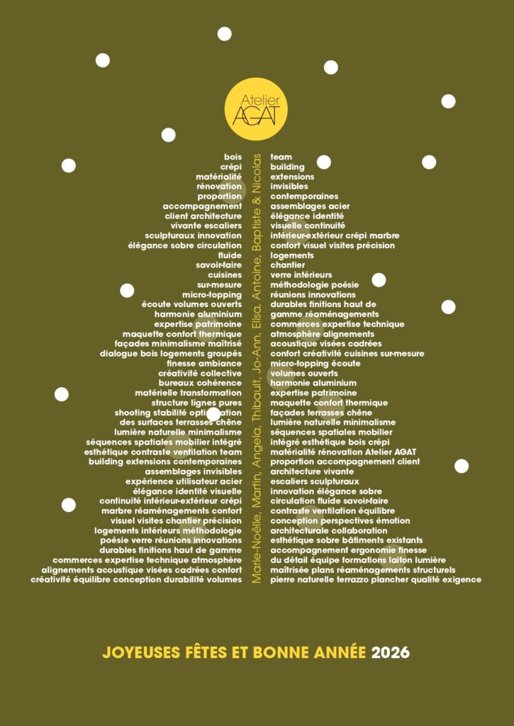 L’Atelier AGAT Architectes sera fermé du 22 décembre au 2 janvier inclus. De retour dès le lundi 5 janvier 2026… prêts à démarrer avec vous une année inspirante et pleine de projets passionnants ! Nous vous souhaitons de très belles fêtes de fin d’année et un excellent début d’année 2026 !